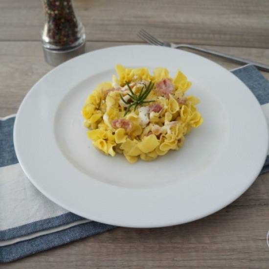 As soon as the nodini are cooked drain them and pour them directly into the pan with the melted stracchino and speck. Mix well, add salt, add grated parmesan (optional) and serve. If you do not like Parmesan but you prefer other types of grated cheese, for example pecorino or caciocavallo, they are all right because the stracchino has such a light taste that it goes well with any type of other cheese.