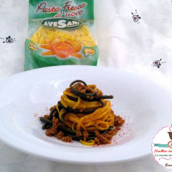 First clean the beans by removing the ends, wash and drain. Take a large pot and fill it with water, when it comes to the boil, add salt and put in the beans. Cook the beans halfway for about 7 minutes, if they still seem too hard, leave them a few more minutes. in a small pan put 2 tablespoons of breadcrumbs and 2 tablespoons of extra virgin olive oil, stir and toast the breadcrumbs, when they are golden brown, turn off the heat because they will continue to toast with the heat of the pan. At this point add the Pastificio Avesani fresh Egg Tagliolini and cook them together with the green beans for 3 minutes. Meanwhile in a pan pour in a little less than ½ glass of oil, the peeled garlic clove and anchovies in oil, fry everything for 2 minutes over medium heat, when the garlic turns golden turn off the heat, after 30 seconds add the sweet chili and if you want some spicy chili too. At this point the Tagliolini should be cooked, drain them and season with the flavored oil, mix well and serve, sprinkling a little muddica atturata over the surface and serve. And your Tagliolini with olive oil fried runner beans and muddica atturrata are ready thanks to Pastificio Avesani and a special thanks to http://saltainpadella.altervista.org/.