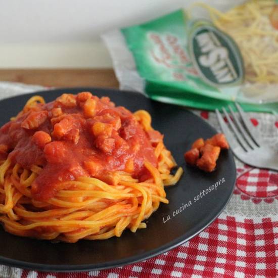 Serve hot! Well, your noodles with spicy sauce and smoked bacon are ready.. Enjoy!